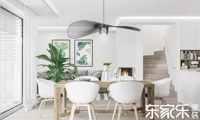 造型感強(qiáng)烈的現(xiàn)代風(fēng)格吊燈在餐廳的空間尤為搶眼,北歐風(fēng)的特點(diǎn)就是簡(jiǎn)單和舒適,開放式廚房和餐桌部分都選擇了大面積的白色,搭配現(xiàn)代風(fēng)格的原木色家具,細(xì)節(jié)滿滿。
