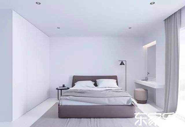 落地床頭燈和簡(jiǎn)約床頭柜造型利落,是這無盡白色空間的恰好點(diǎn)綴,這無盡的白是夜里寧靜的睡夢(mèng)