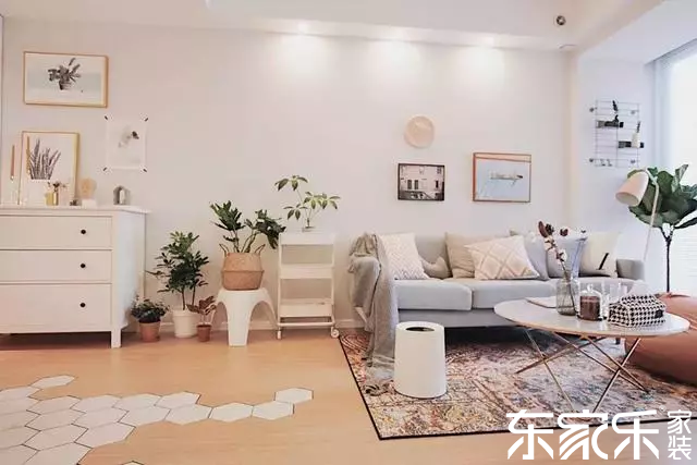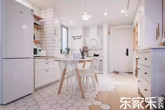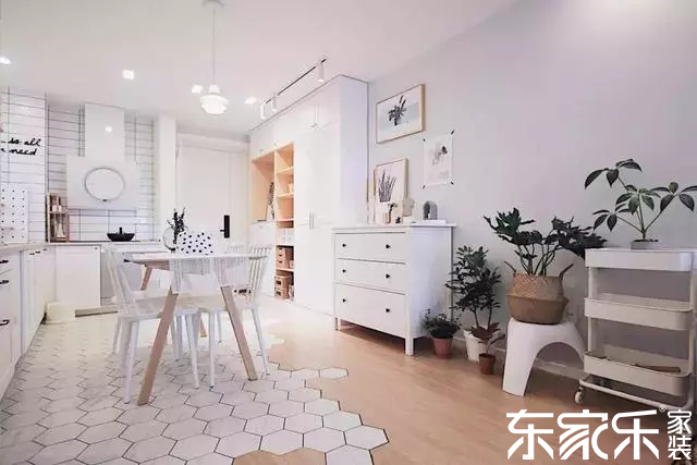 入戶沒有玄關(guān),一側(cè)靠墻設(shè)計了鞋柜和收納柜,另一側(cè)是開放式的餐廚區(qū)域,實木地板與六角磚的拼接組合,瞬間提升整個家居的顏值。