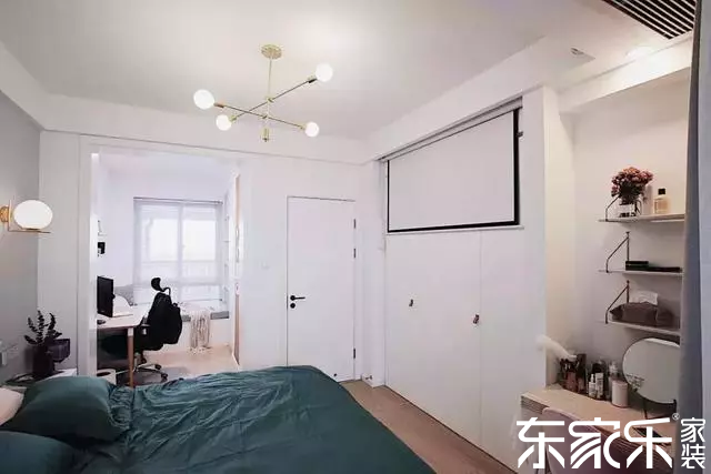 床頭靠窗的區(qū)域,被設(shè)計成小書房,簡單的擺放一張書桌和椅子,小小的空間作為娛樂辦公來使用,非常實用,臥室沒有擺放電視的空間,所以裝了一個投影儀,休閑時間可以看看電影也是不錯的選擇。