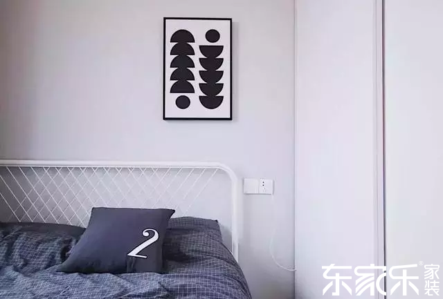 次臥的布置相對簡單,整體以淺灰色為基調(diào),搭配白色鐵藝床和黑白掛畫,簡約舒適。