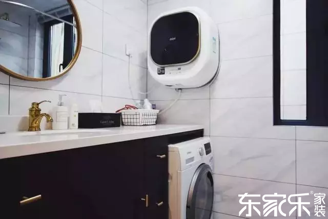 衛(wèi)生間整體是黑白搭配的,洗衣機(jī)放置在洗漱柜中,臺面可以放置不少東西。大理石墻磚加上些許金屬點綴,充滿精致格調(diào)。