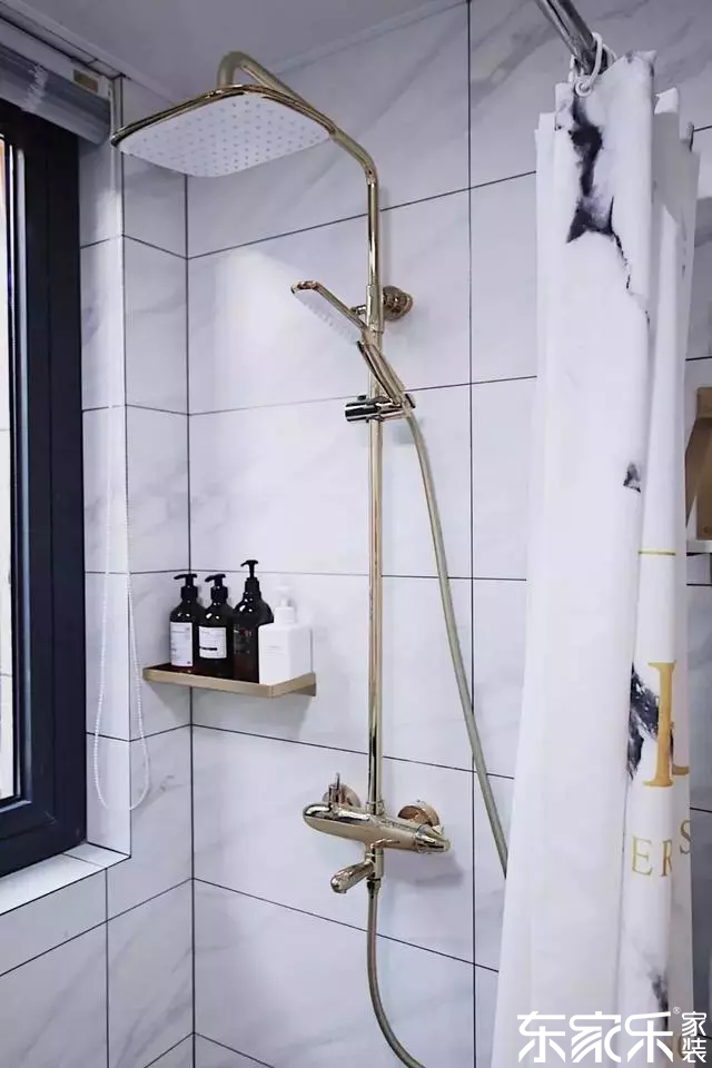 干濕區(qū)用一塊浴簾作為隔斷,實用又能有效的阻擋水,花灑選的是恒溫的,避免洗澡來回調(diào)節(jié)溫度。
