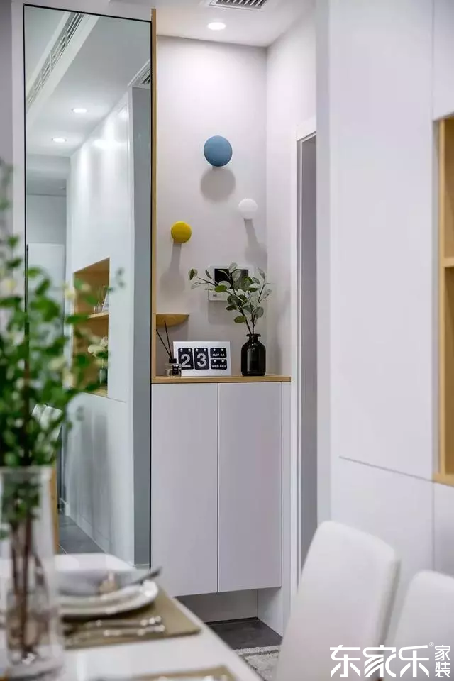玄關(guān):小二居空間不足,再考慮風水等問題,最后只做了一個很小的玄關(guān)柜,為了實用,鞋柜底部還做了留空設(shè)計,柜子旁邊的鏡子,既是全身鏡,也有放大空間的效果。