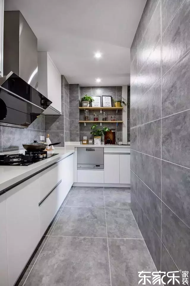 廚房以灰色調(diào)為主,狹長L型的設(shè)計,讓廚房雖小卻足夠用。