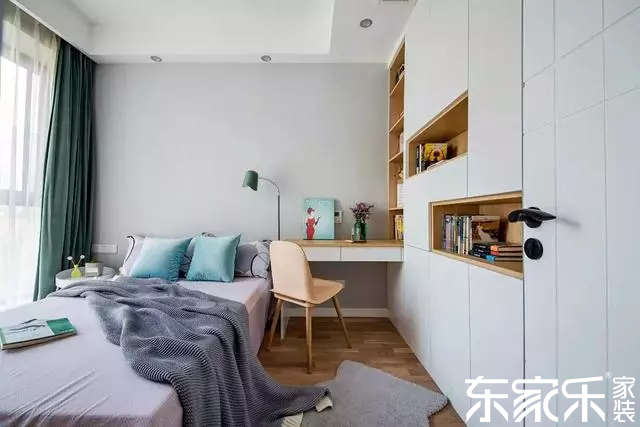 兒童房做了整面的柜子用于收納,靠近床頭位置還延伸出一塊區(qū)域供孩子學習。