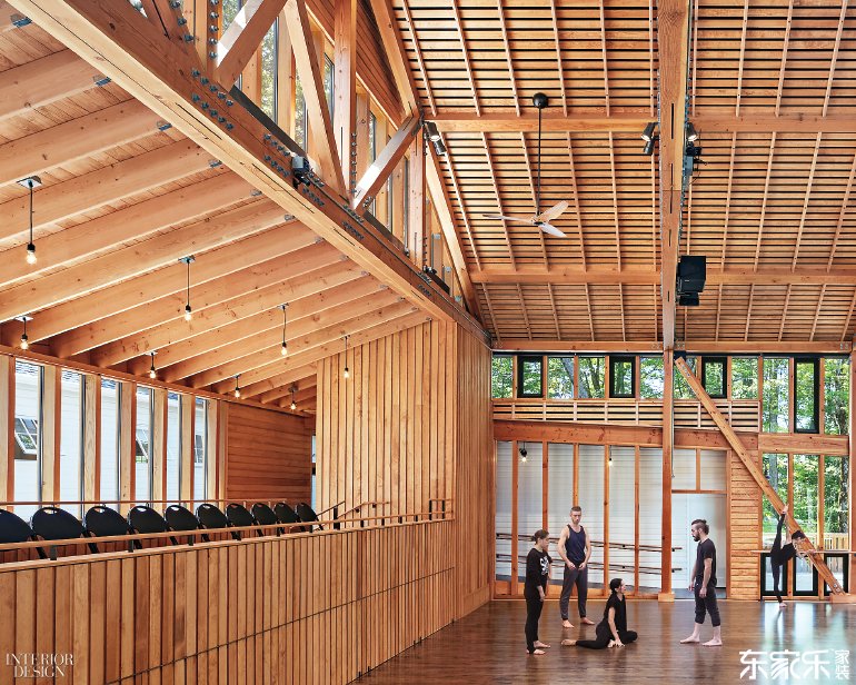 在堅(jiān)持流行的鄉(xiāng)土風(fēng)格的同時(shí),該工作室“非常適合我們這個(gè)時(shí)代”,弗蘭斯堡總裁David Croteau說(shuō)。傳統(tǒng)谷倉(cāng)設(shè)計(jì)有水晶圓屋頂,環(huán)繞式天窗和兩個(gè)窗戶墻?所有這些玻璃讓舞者可以欣賞到伯克希爾山的風(fēng)景,同樣重要的是,參觀者可以在里面看到舞者們?cè)诰毩?xí)。除玻璃以外,這座面積達(dá)7400平方英尺的建筑是一種木結(jié)構(gòu)建筑:外部采用西部紅柏樹(shù),內(nèi)部墻壁和天花板采用道格拉斯冷杉和松木,彈性地板采用染色楓木。梁和桁架支持燈光以及揚(yáng)聲器系統(tǒng),這對(duì)參加者坐下時(shí)幾乎是看不見(jiàn)的。順便說(shuō)一下,座椅解決方案聰明但技術(shù)含量低。為了沿著一側(cè)補(bǔ)充陽(yáng)臺(tái),從陽(yáng)臺(tái)底部滑出的平臺(tái)可以容納額外的折疊椅,在不需要時(shí)存放在衣柜中。