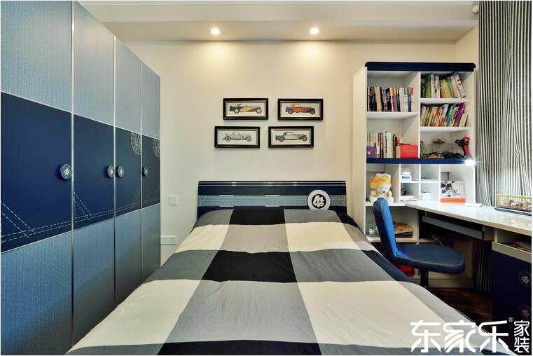 次臥室以藍(lán)色和白色為主色調(diào),白色的墻面和書桌書柜與藍(lán)色的衣柜和椅子相結(jié)合,再搭配幾幅色彩豐富的掛畫,讓空間更加生動活潑。