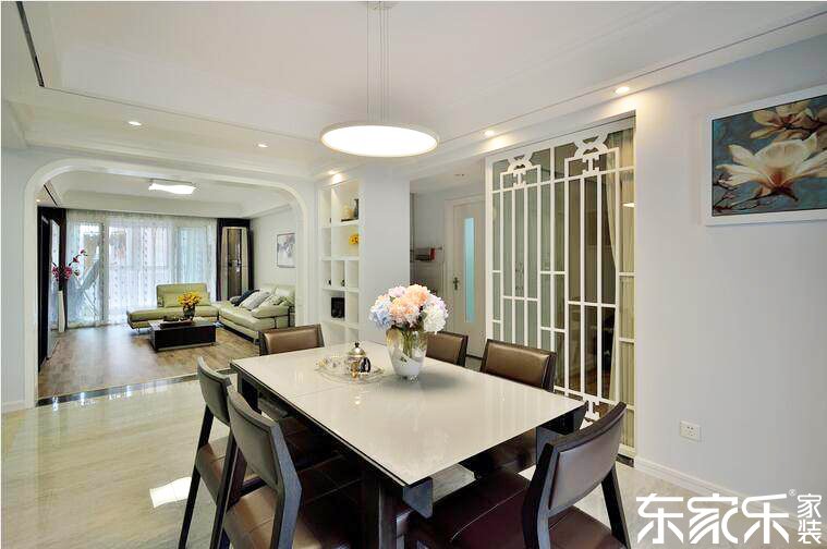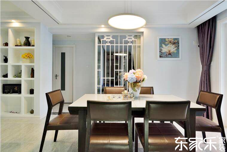 餐廳白色的墻面、白色的餐桌搭配深色軟包餐椅,中式隔斷配上藍(lán)底白花掛畫顯得比較儒雅。