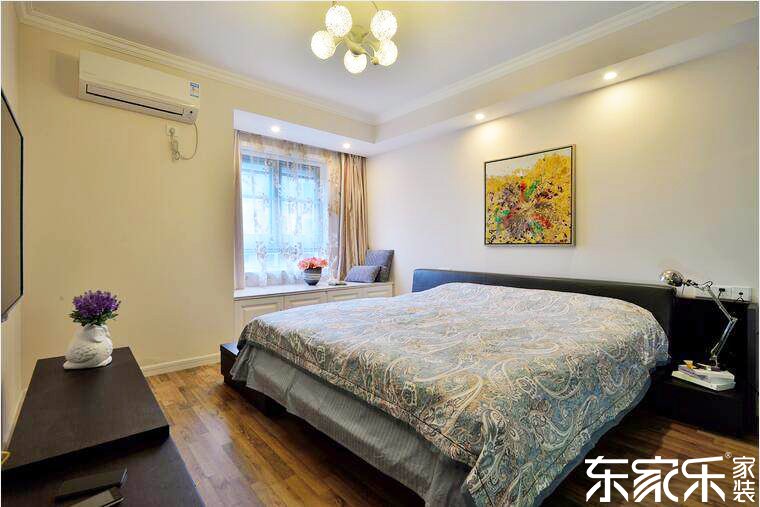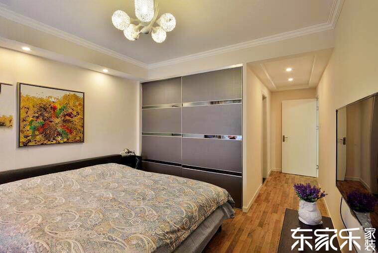 主臥室以灰色和白色為主色調(diào),搭配黃色和紫色的軟裝,看起來也是生動充滿活力。乳白色的墻體與原木色的木地板增加了空間的舒適度,黃色的裝飾畫和紫色的薰衣草裝飾花則豐富了空間的色彩。