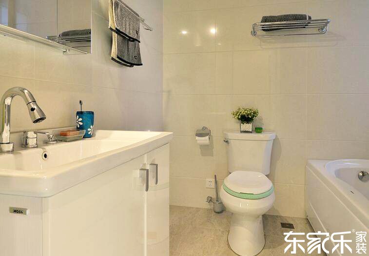 衛(wèi)生間的裝修比較現(xiàn)代化,白色的墻面、浴室柜及衛(wèi)浴等顯得空間非常干凈整潔,一小盆綠植的出現(xiàn)讓空間不失清新。